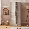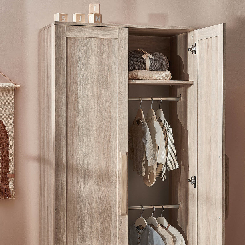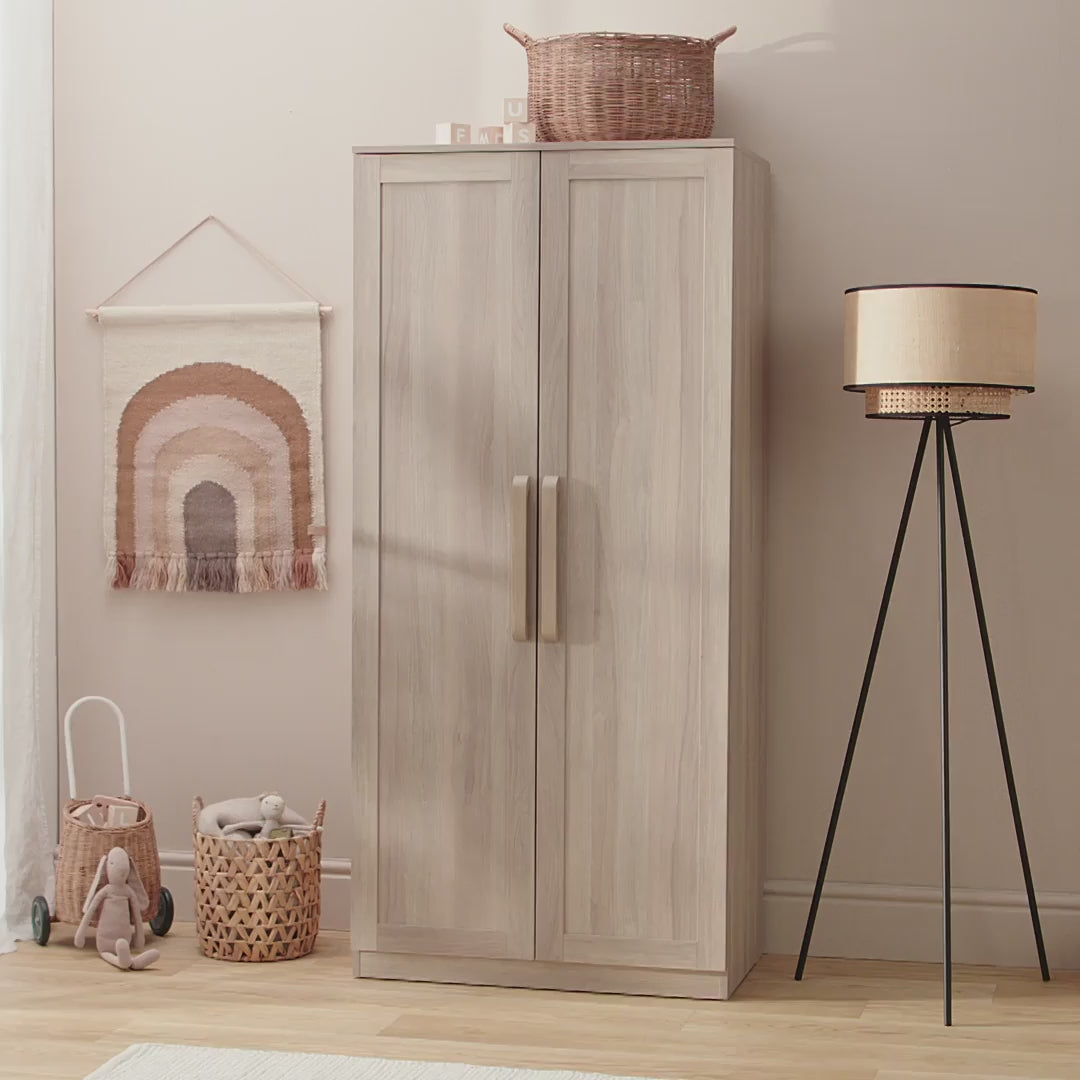 Featuring two hanging rails and an overhead shelf, the full-size Bromley Oak wardrobe has plenty of space for hanging your little one’s clothing. With a warm oak veneer finish and coordinating handles, it's the perfect addition to your dream nursery.